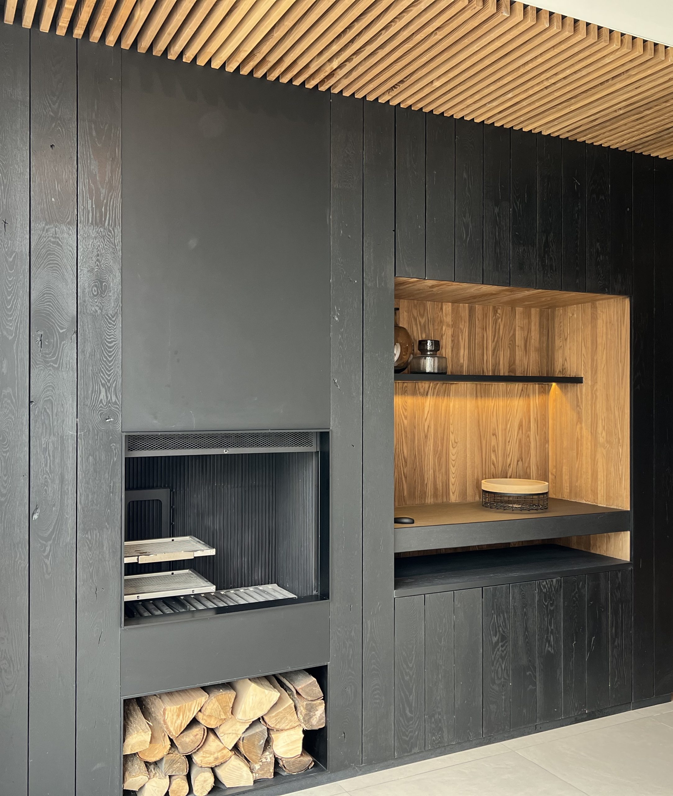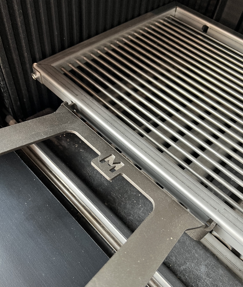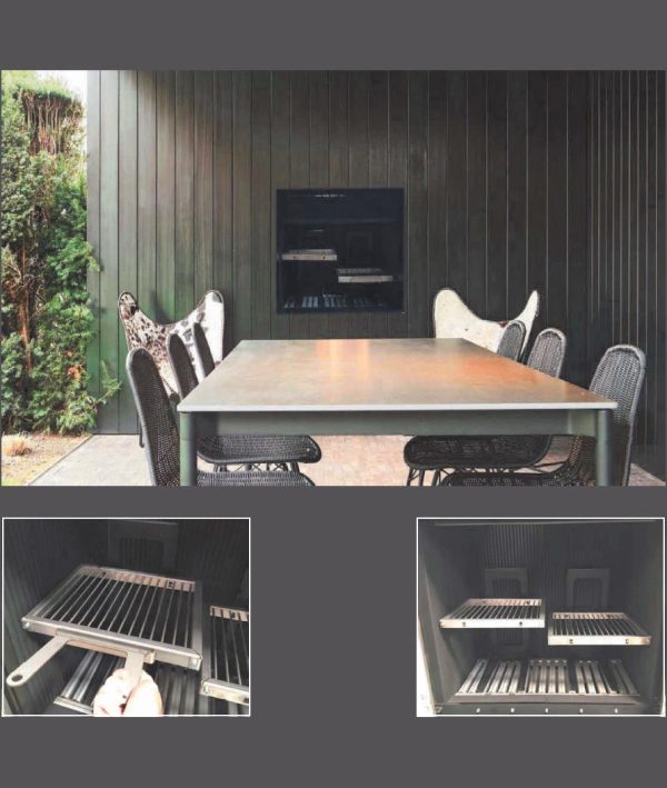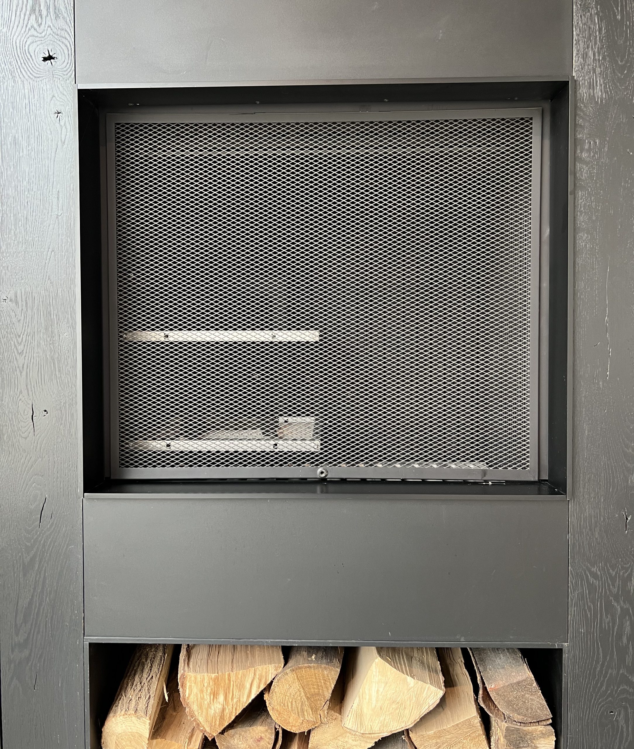 Топка — барбекю Луна 850 V BBQ. Поставляется в комплекте с доборной рамкой 7,5 см, без стеклянной дверцы, с поднимающимся сетчатым экраном, с грилями.